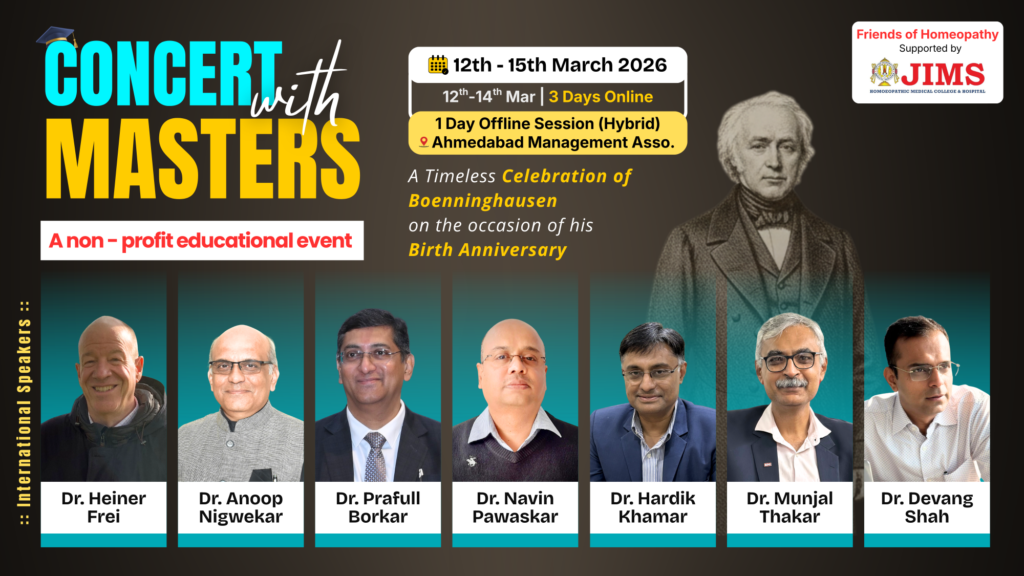 Celebrate the timeless legacy of Boenninghausen with Concert with Masters – a unique, non-profit educational gathering co-created by Friends of Homeopathy and JIMS Homoeopathic Medical college. This special event brings together 7 global icons of Homeopathy, including Dr. Heiner Frei, Dr. Devang Shah, Dr. Anoop Nigwekar, Dr. Prafull Borkar, Dr. Navin Pawaskar, Dr. Munjal Thakar, and Dr. Hardik Khamar.